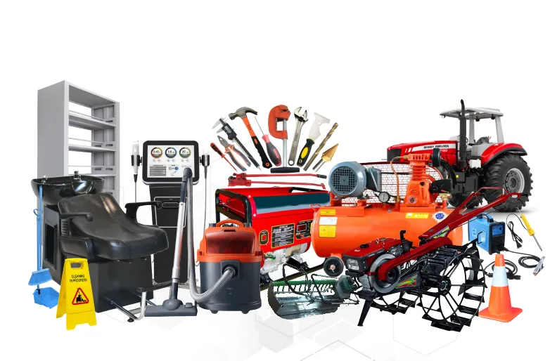 Berbagai alat industri, power tools, mesin kerja, alat ukur, dan perlengkapan keselamatan.